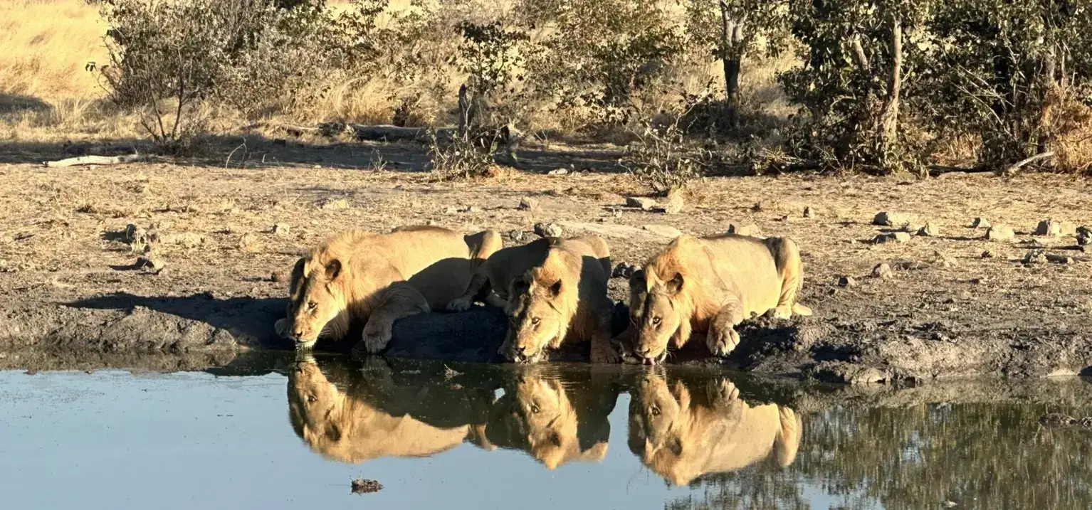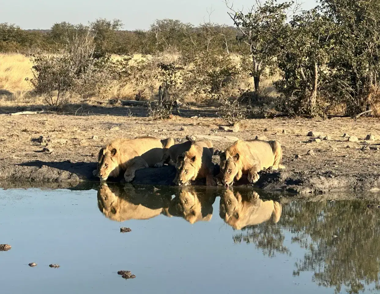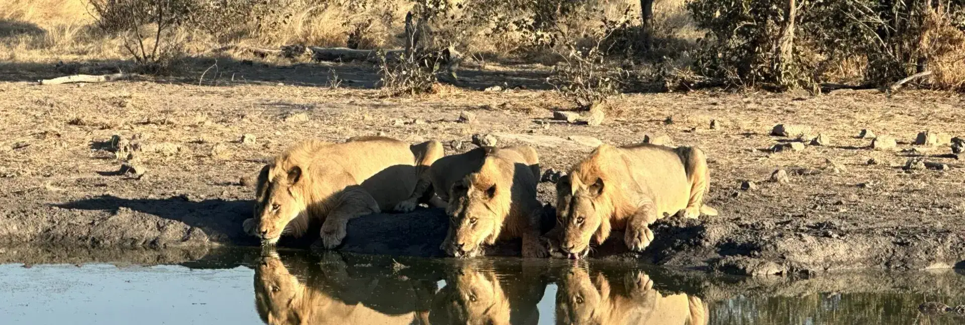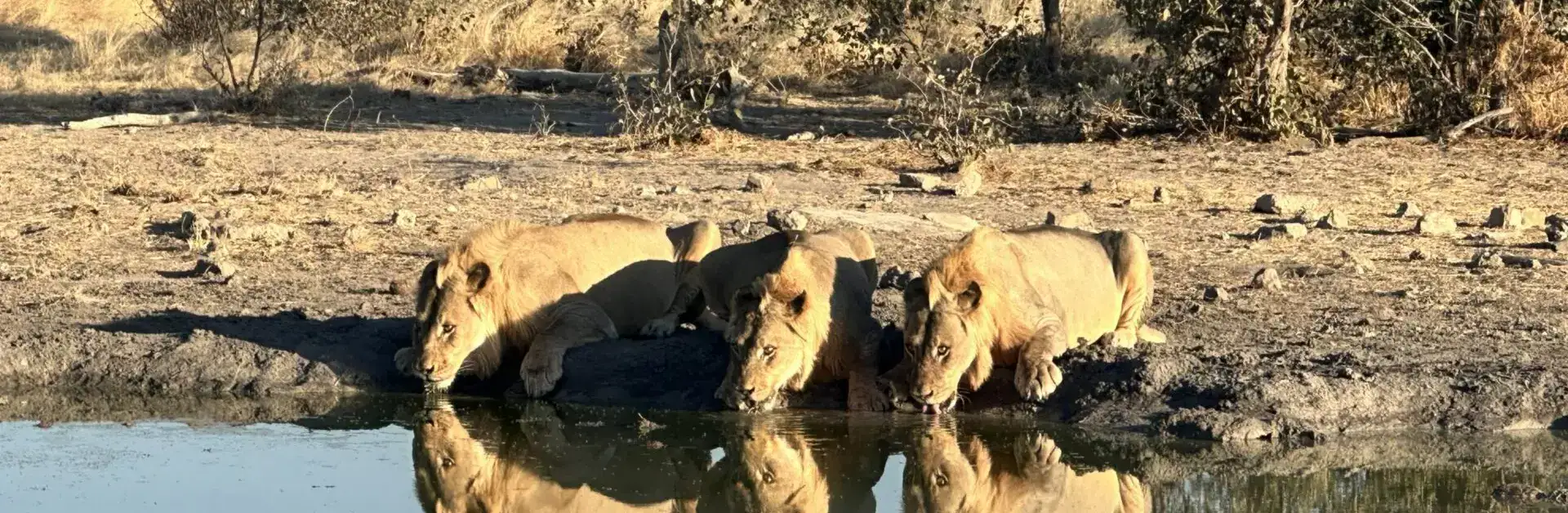Was für ein Bild! Junge Löwen (man erkennt sie an den noch zaghaft wachsenden Mähnen) trinken nach der Jagd am Wasserloch, mit einem Blick immer in die Steppe, ob ihnen nicht doch ein älteres Tier das Wasser streitig macht.