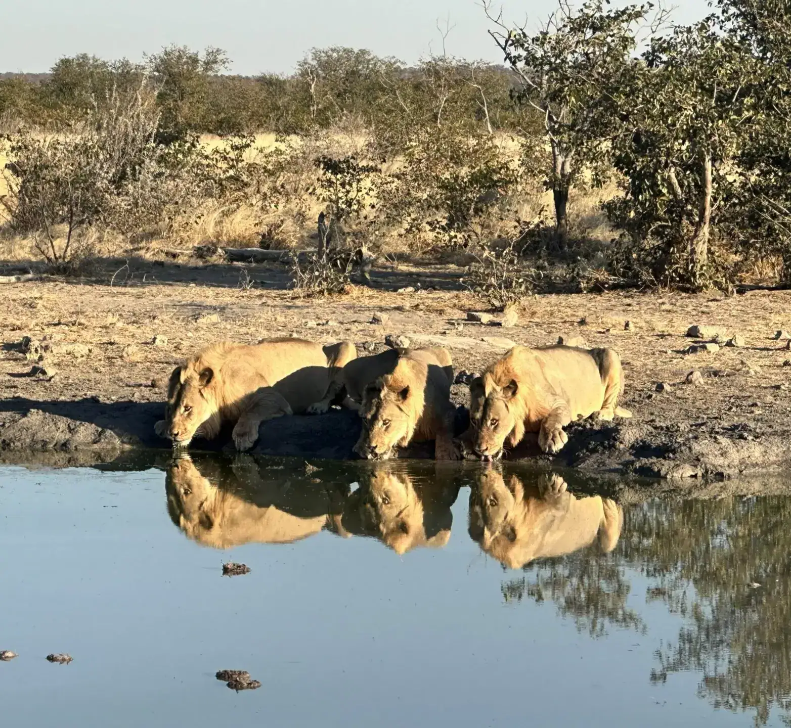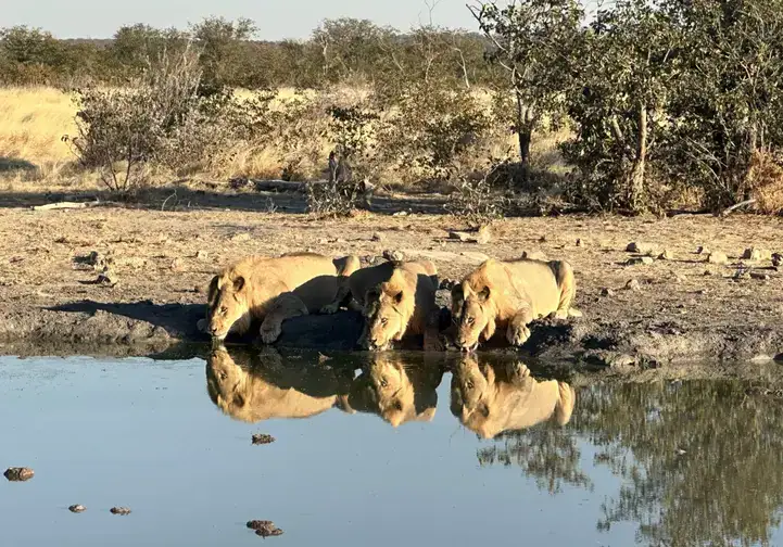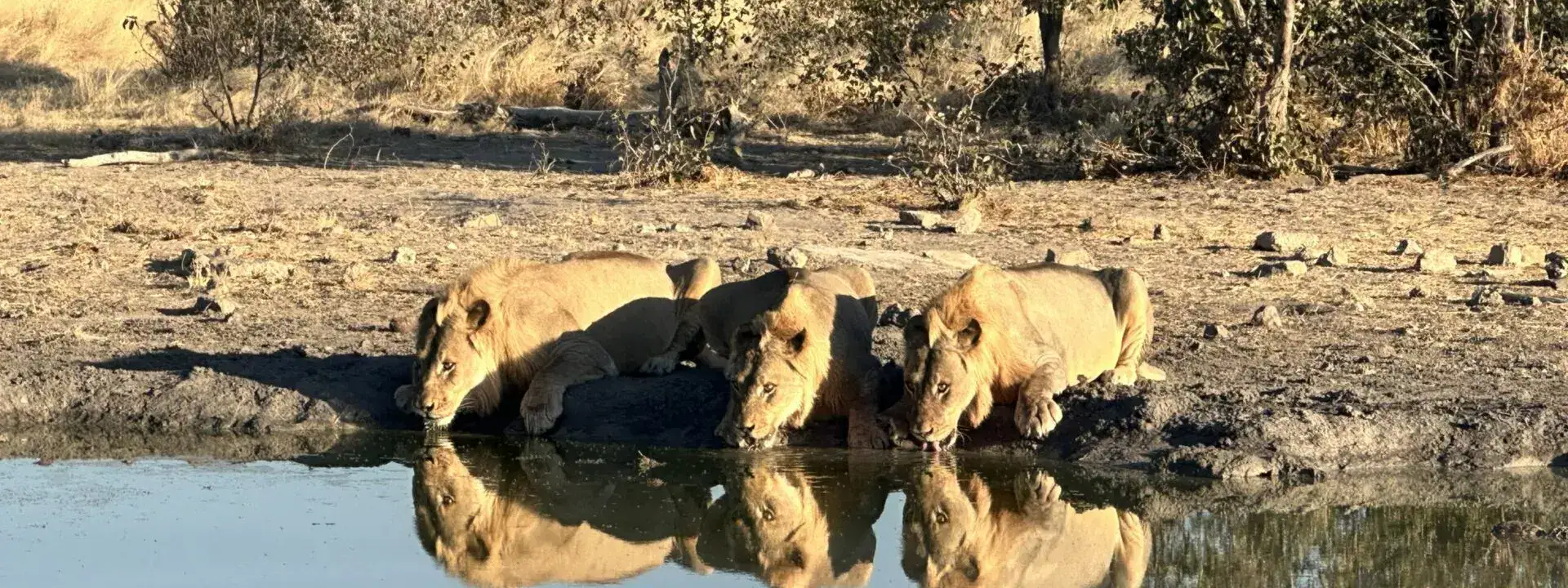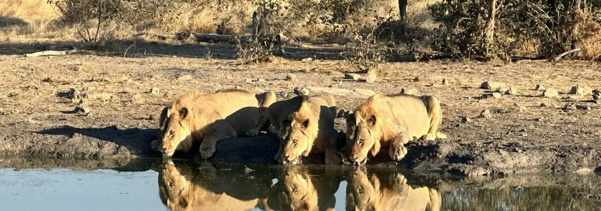 Was für ein Bild! Junge Löwen (man erkennt sie an den noch zaghaft wachsenden Mähnen) trinken nach der Jagd am Wasserloch, mit einem Blick immer in die Steppe, ob ihnen nicht doch ein älteres Tier das Wasser streitig macht.