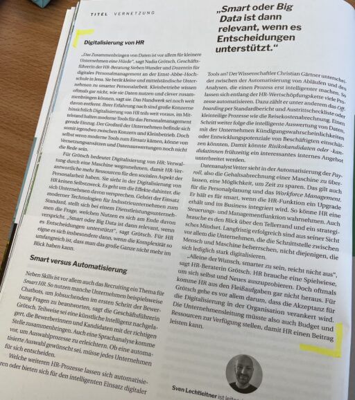 Da zitieren wir uns doch einfach mal selbst. Für das aktuelle Heft des Human Resources Manager mit dem Titel "Vernetzung" wurden wir zum Thema Smart HR interviewed. Das inflationär genutzte "smart" ist aus unserer Sicht kein Selbstzweck. Was nicht eine spürbare Verbesserung für HR-Team und Mitarbeiter bringt, ist nicht smart, egal wie digital es sein…